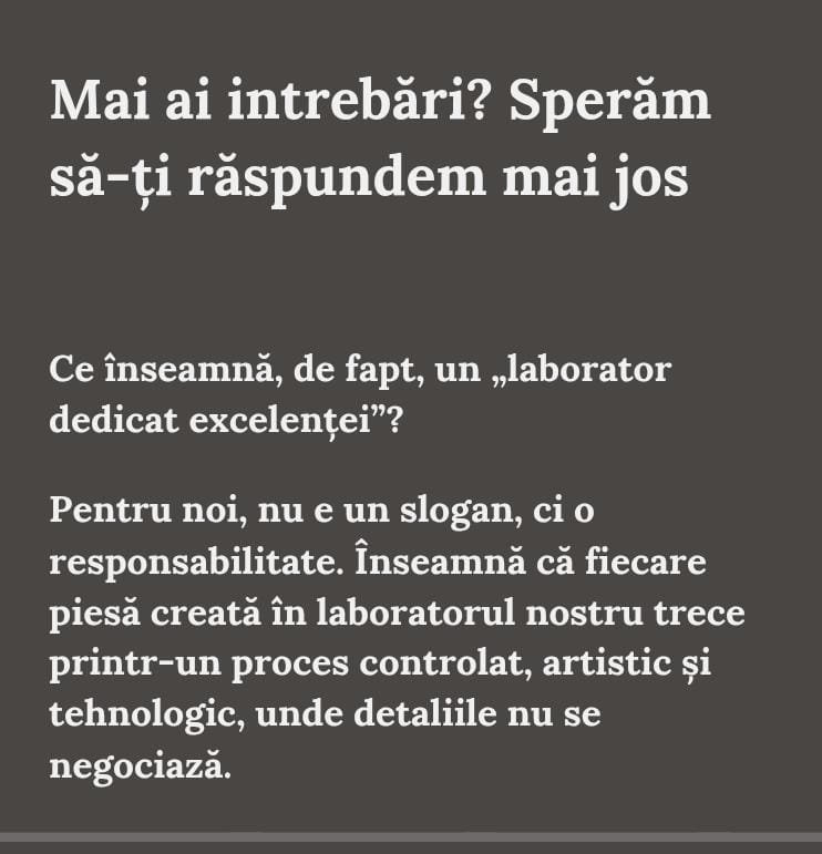 Fiecare lucrare realizată în laboratorul nostru este rezultatul unui proces meticulos, în care tehnologia de ultimă generație se întâlnește cu meșteșugul și viziunea artistică.