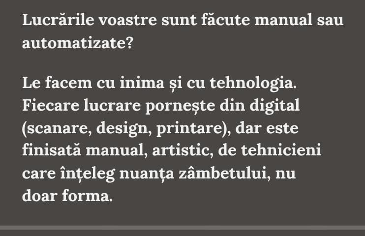 Aici, lucrările nu se „fabrică”, ci se creează, cu un control total asupra fiecărei etape, din prima amprentă până la ultima glazură. Pentru că zâmbetele de durată nu se fac în serie, ci în profunzime.