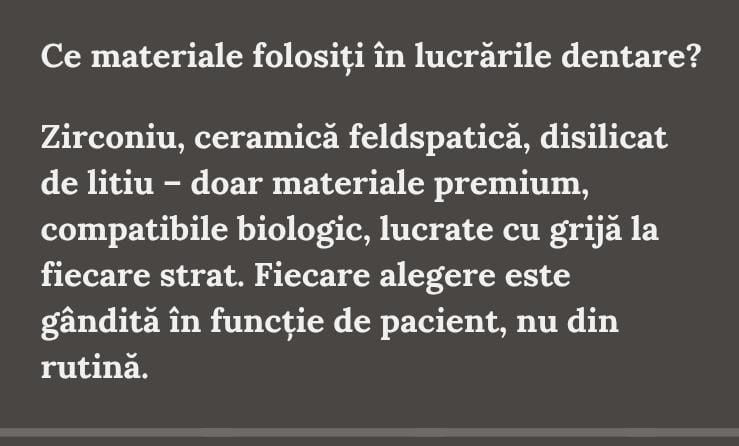 În laboratorul nostru alegem doar materiale de ultimă generație – ceramici cu estetică translucidă, aliaje biocompatibile, compozite care imită structura dentară naturală. Nu ne jucăm cu lucrurile care trebuie să reziste zeci de ani.
