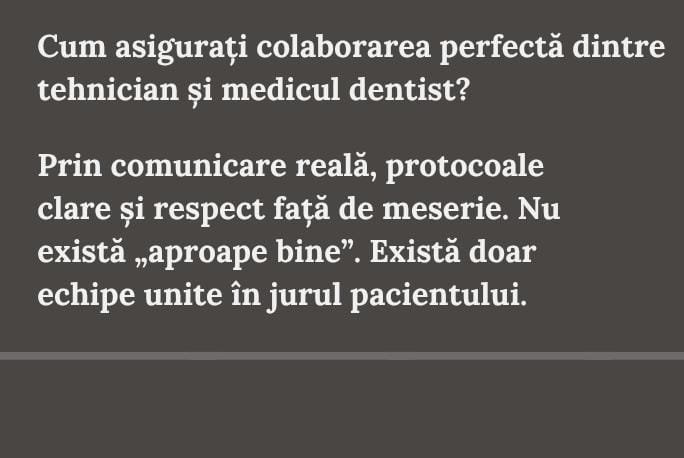 Adevărata magie se întâmplă atunci când dentistul nu este doar un medic, iar tehnicianul nu este doar un executant – suntem o echipă, împărtășind același obiectiv: să oferim pacienților nu doar funcționalitate, ci și încredere în fiecare zâmbet.