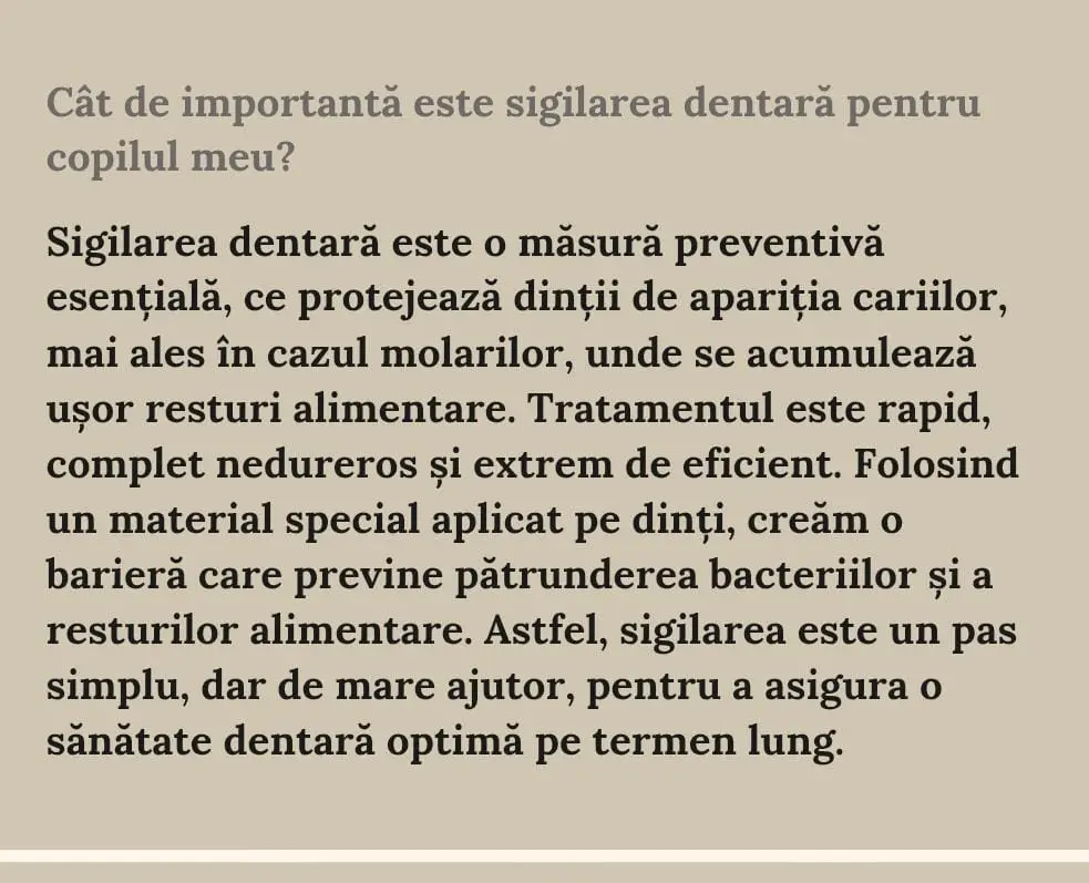 Prevenția este cheia! Sigilarea dentară este o metodă rapidă și eficientă de a proteja dinții copilului tău de cariile care pot apărea, mai ales în zonele greu accesibile.
