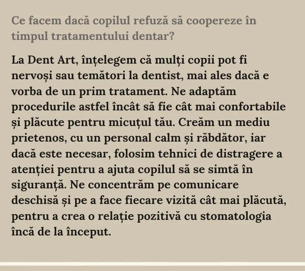 Ne asigurăm că micuțul tău se simte confortabil și în siguranță, iar părinții primesc informațiile necesare pentru a sprijini sănătatea orală a copilului lor.